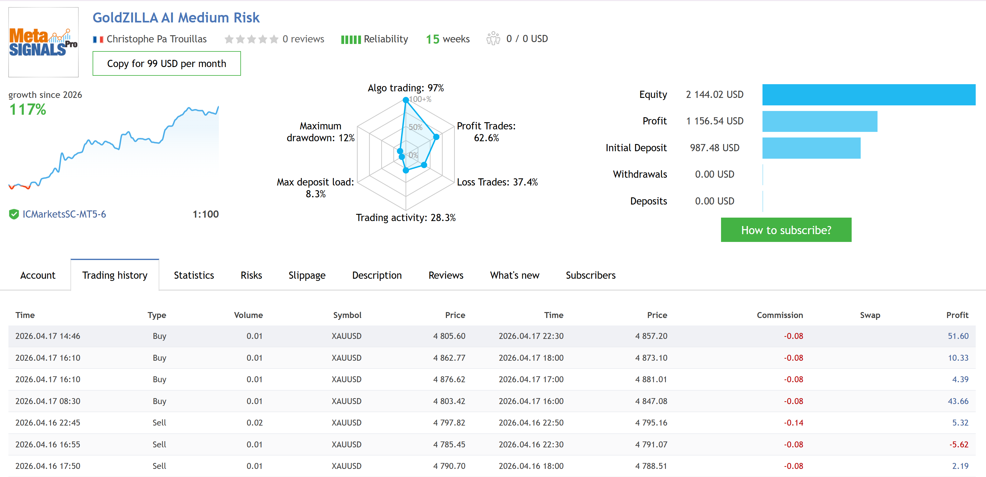 We created this trading algo to complete our risk-managed systems architecture with Capital Preservation at core. GoldZILLA AI is a multi-strategy algorithm detecting market regimes to dynamically select from five distinct strategies, optimizing returns while minimizing drawdown on XAUUSD...