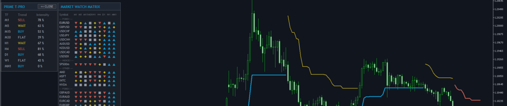 Vantage FX Matrix Vantage FX Matrix is a dashboard indicator designed for monitoring multiple assets. It combines a correlation matrix for 8 major currencies with a custom watchlist for other symbols provided by your broker (e.g., crypto, metals, indices). Key Features: Logic and Calculation: The indicator calculates the relative strength of 8 currencies (USD, EUR, GBP, CHF, JPY, AUD, CAD, NZD) by analyzing 28 pairs across 5 timeframes (M5–D1). The algorithm does not repaint. Momentum Arrows