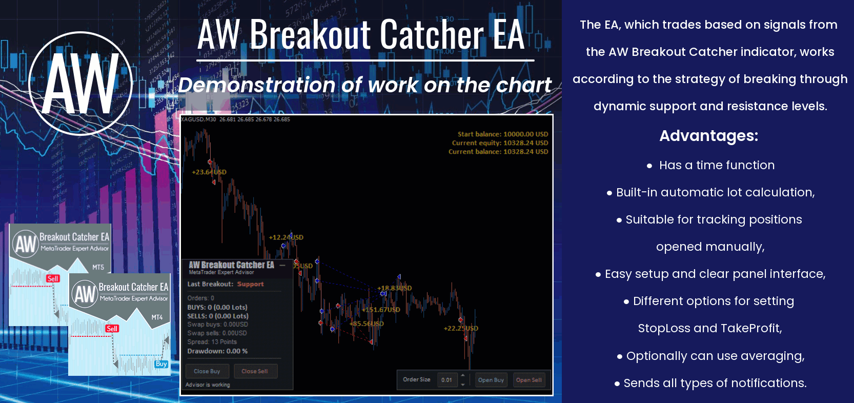 AW Breakout Catcher EA that trades by indicator signals AW Breakout Catcher. The advisor works by a strategy to break the dynamic levels of support and resistance.