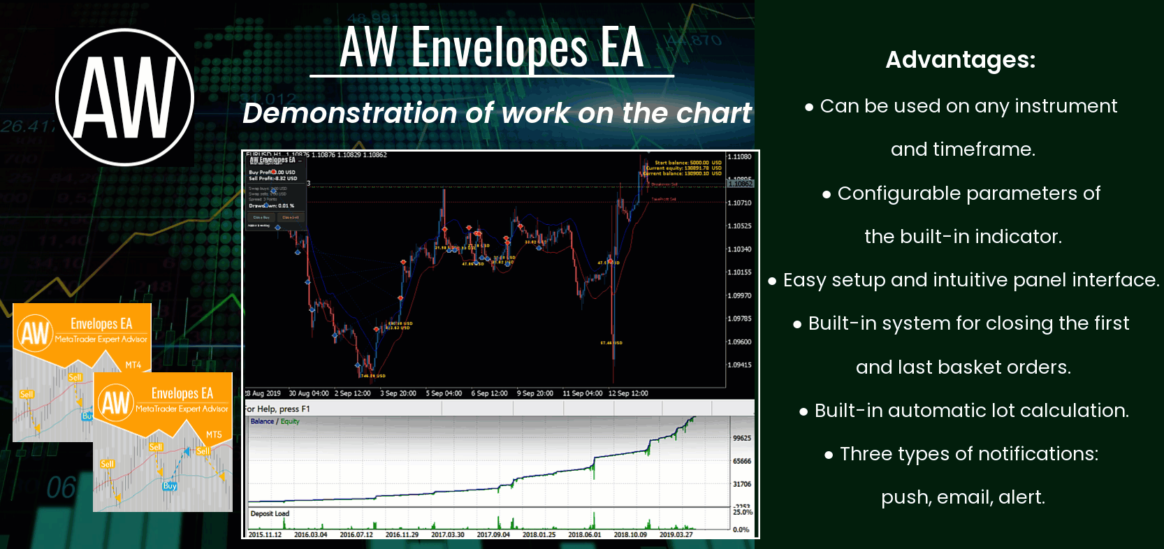Fully automated trading robot. The advisor works by strategy the breakout of dynamic support and resistance levels, the well-known Envelopes indicator is used to determine the signals. In addition, the EA implements the possibility of averaging, the function of closing the first and last basket orders and the function of automatic lot calculation, three types of notifications.