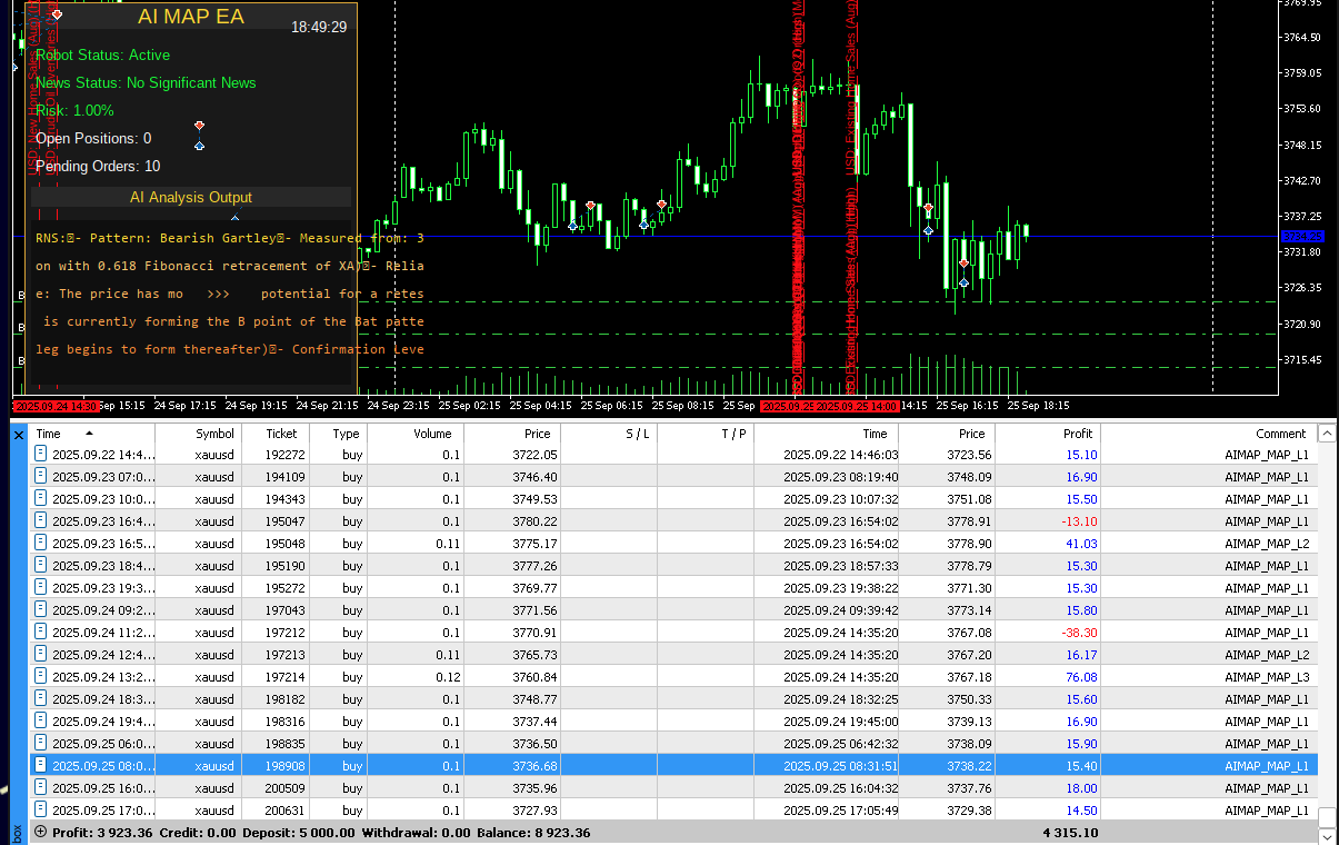 AI MAP - это передовая автоматизированная торговая система, которая использует 10 различных ядер искусственного интеллекта для анализа рыночных условий и выполнения точных сделок. Система работает через сложный алгоритмический анализ, объединяя несколько ИИ-движков для определения оптимальных точек входа и выхода на волатильных валютных рынках. Основная Технология Торговый советник использует многослойную архитектуру ИИ, где каждое из 10 ядер специализируется на различных аспектах рыночного
