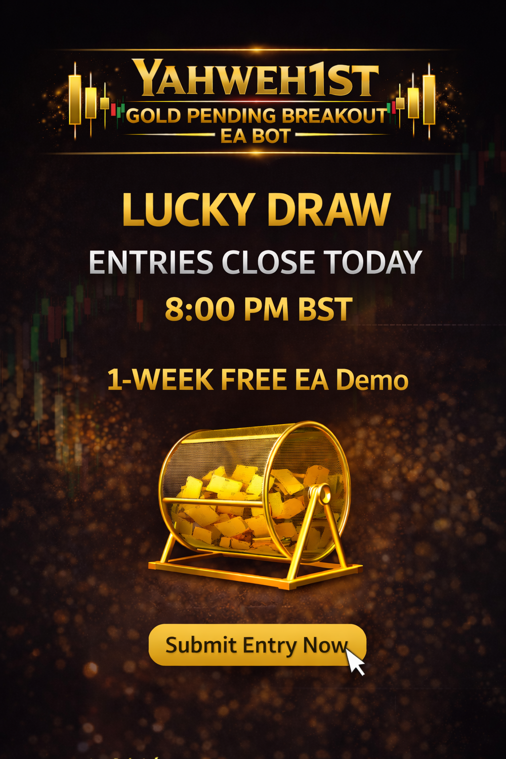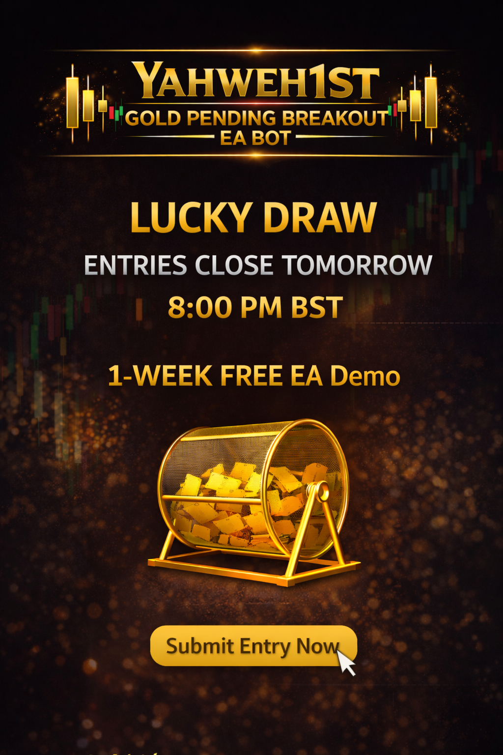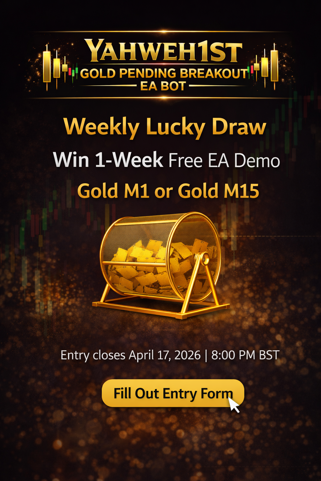 One person will be selected for a 1-week free demo trial of Gold M1 Or Gold M15 Pending Breakout EA with setup guidance.