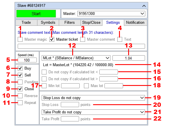 - Sihirli sayı (Slave tanımlayıcısı) * – Trade Copir tarafından Slave modunda açılan emir ve pozisyonların tanımlayıcısı. Slave kopyalayıcı, emir ve pozisyonlarını bu numarayla imzalayarak, emir ve pozisyonlarını daha sonra başkalarının emir ve pozisyonlarından ayırt eder.