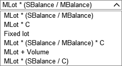 - MLot * (SBalance / MBalance) * C - Sipariş (pozisyon) lotu, alıcının hesabındaki bakiyenin tedarikçinin hesabındaki bakiyeye, belirtilen katsayı ile çarpılmasıyla orantılı olacaktır. Yani sipariş lotu (pozisyonu) Bakiyeye Oransal ve Katsayı ile Çarpma yöntemleri aynı anda kullanılarak hesaplanacaktır,