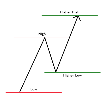 Bu durumda, piyasadaki güçlü taraf alıcılardır. Grafikte fiyatın açıkça daha yüksek düşükler ve daha yüksek yüksekler oluşturduğunu görebiliriz. Aşağıdaki şekil yükseliş trendinin grafiğini göstermektedir: