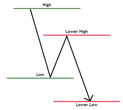 Bu durumda, satıcılar piyasada güçlü olan taraftır ve fiyatı aşağı çeker. Grafikte fiyatların daha düşük yüksekler ve daha düşük düşükler oluşturduğunu görebiliriz.