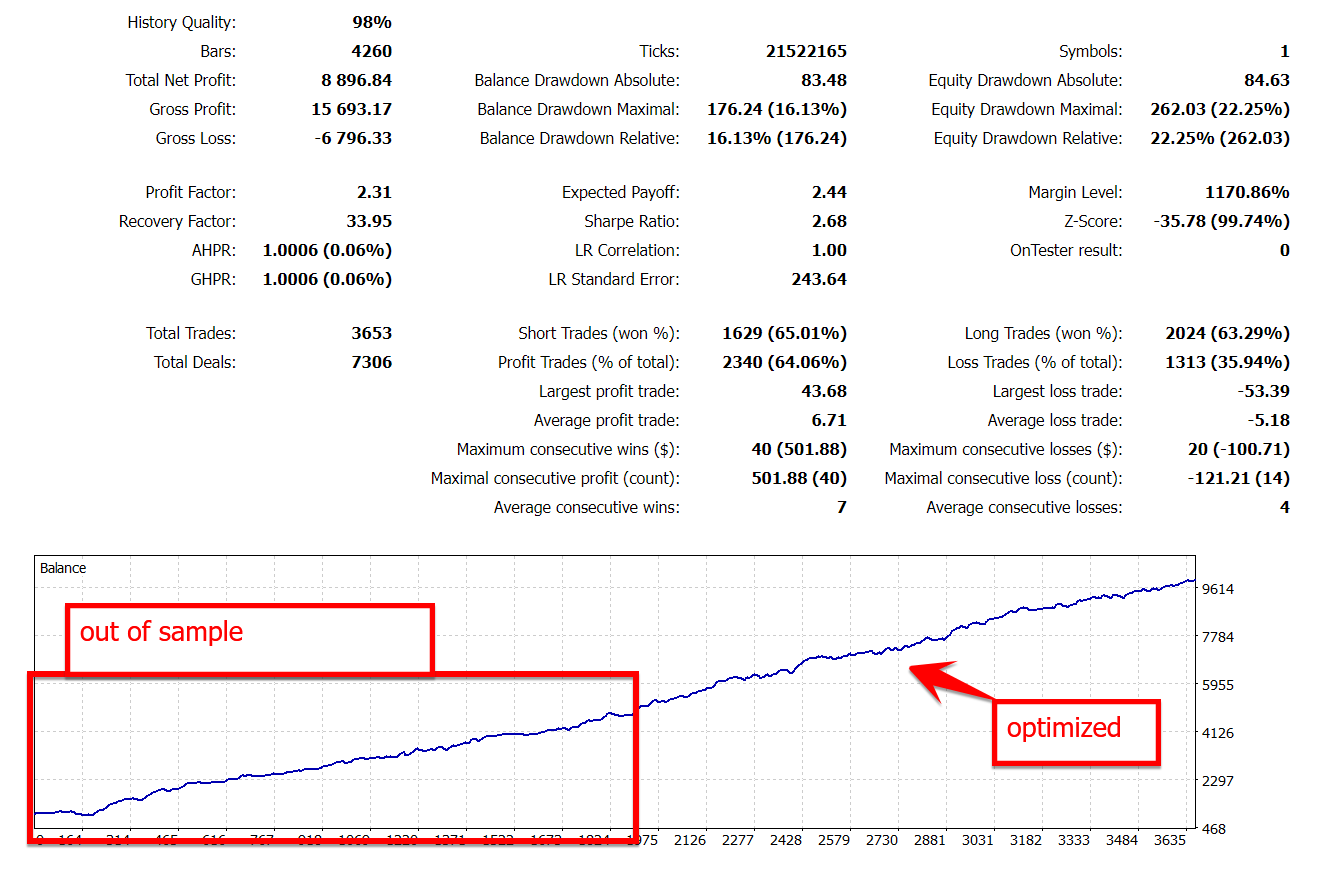 2007-2023 backtest. As you can see, the EA shows almost identical performance in the out-of-sample period, which is a great indicator for future performance!