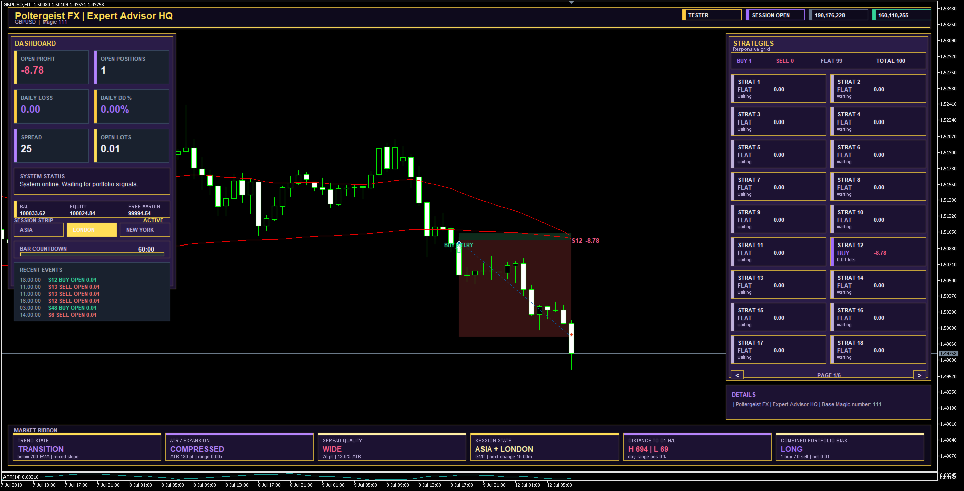 Poltergeist FX Bu, şu amaçlarla tasarlanmış bir danışmandır: GBPUSD H1 Yapılandırılmış işlem fırsatlarını belirlemek ve disiplinli, kural tabanlı bir yaklaşımla pozisyonları yönetmek için tasarlanmış bir grafik. Saatlik zaman diliminde çalışmak, sistemin piyasa yapısını, momentumu ve fiyat dinamiklerini daha düşük zaman dilimlerine göre daha istikrarlı bir şekilde değerlendirmesine olanak tanır.