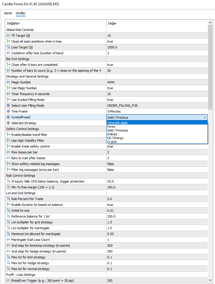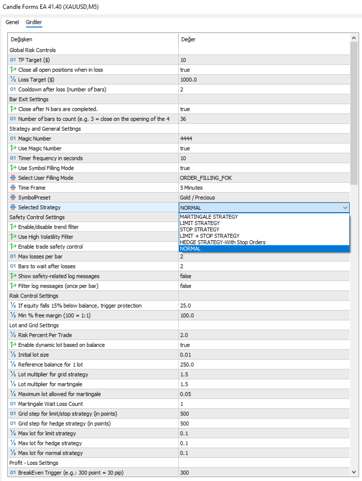 Candle Forms EA, kullanıcıya göre özelleştirilebilen 6 ayrı stratejiyi destekler: