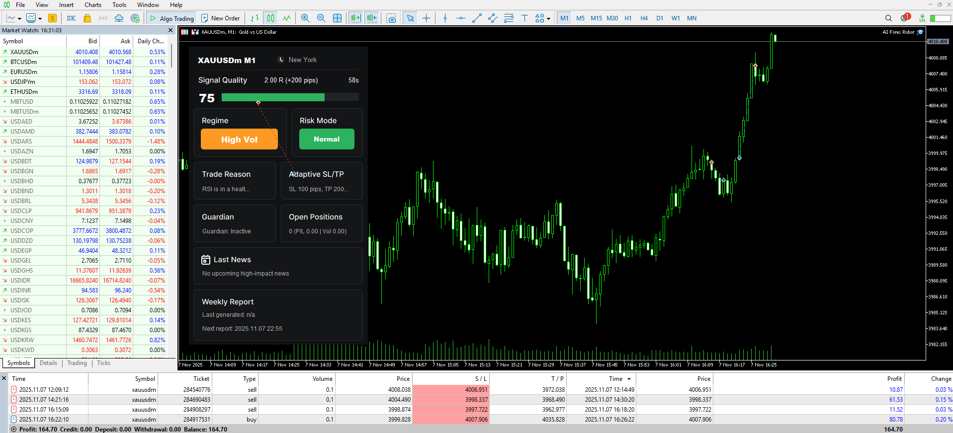 AI Forex Robot uses artificial intelligence to analyze the market in real time, filter signals, adjust risk and make smarter trading decisions. This gives it a major advantage and makes it more flexible and efficient.