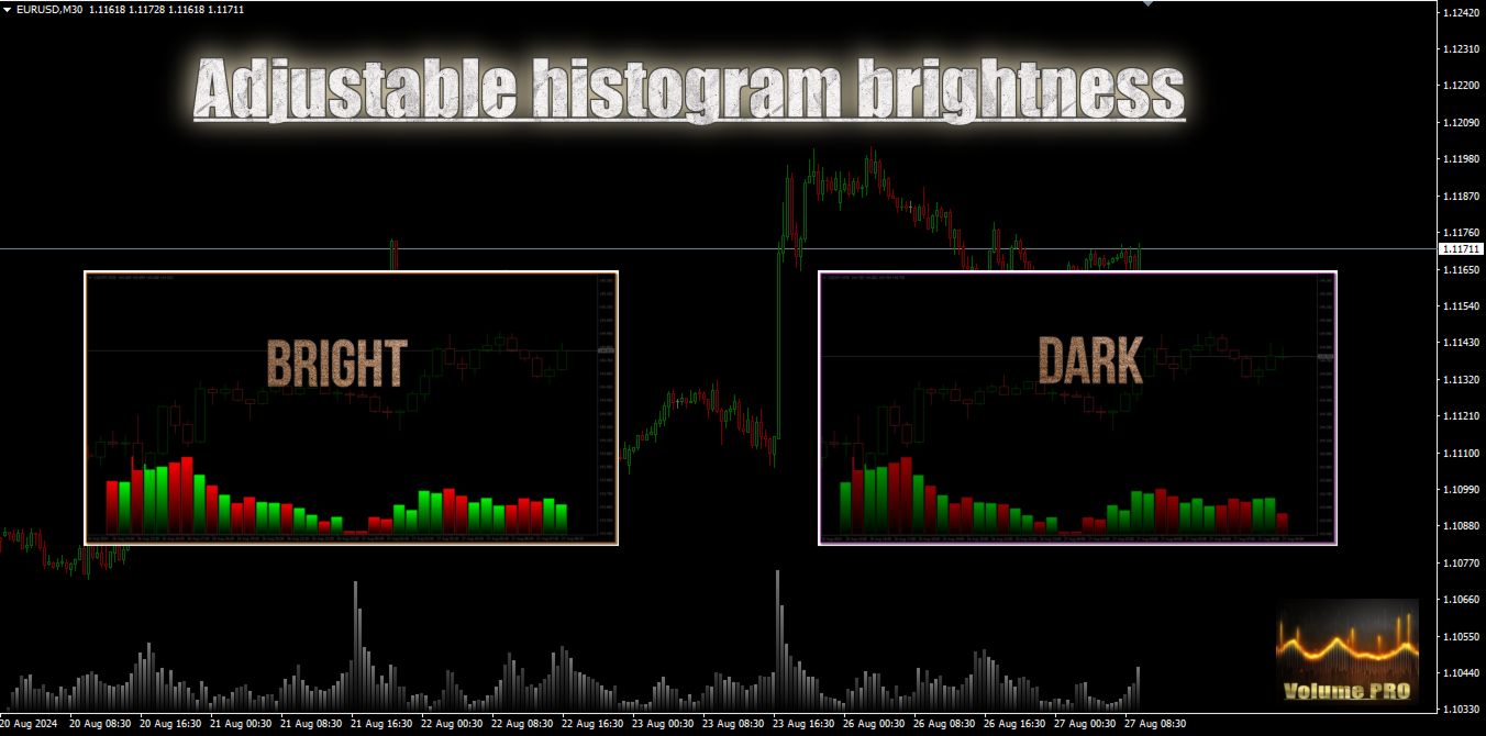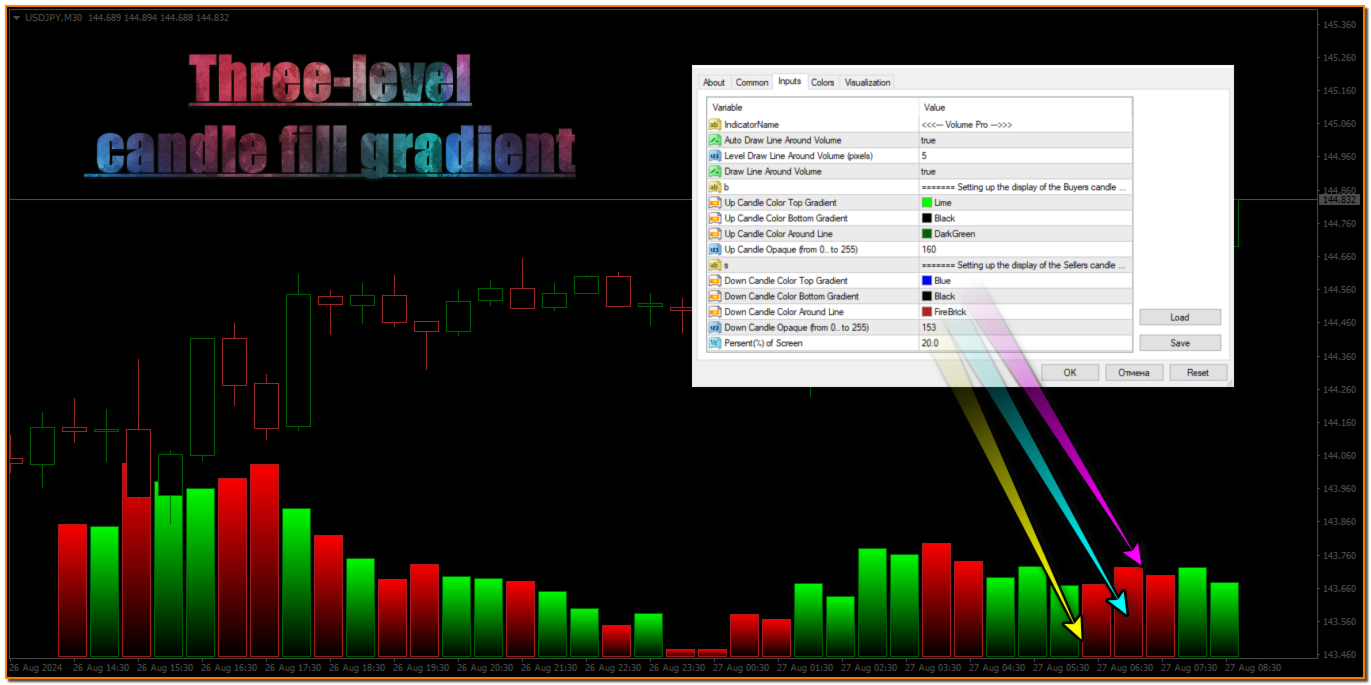 Innovative volume analysis: Volume PRO - uses advanced analysis methods to accurately assess trading volumes. Growing volumes confirm the strengthening of the trend, while decreasing volumes can signal a sideways movement (flat) or the end of the current trend. This allows traders to avoid ineffective trades and find optimal moments to enter the market. Abnormally high volumes can indicate an upcoming trend reversal.