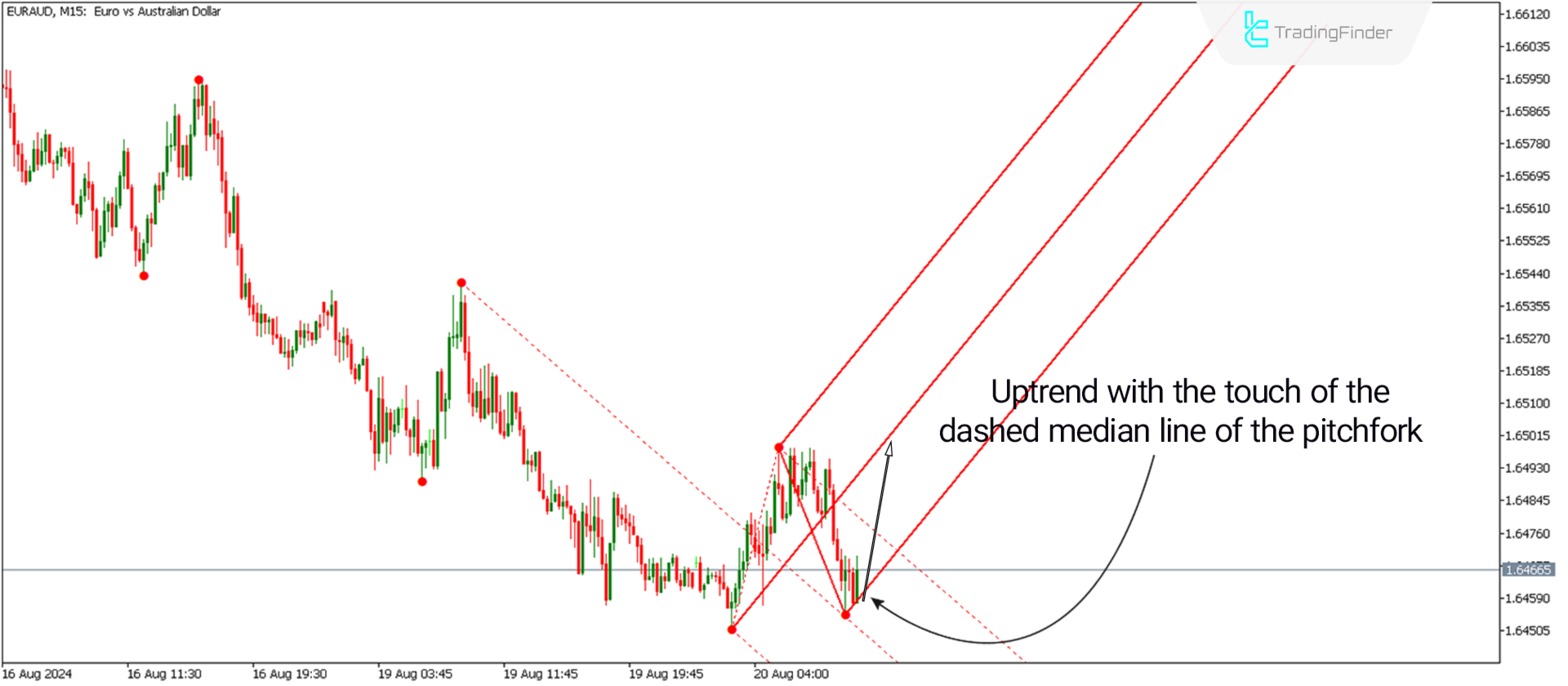 On the EURAUD 15-minute chart, the indicator selects the latest three relevant pivots (peak–trough–peak) to create a dashed-line pitchfork. Once price retests the median line, a bullish signal is triggered, suggesting a long entry setup aligned with trend continuation.