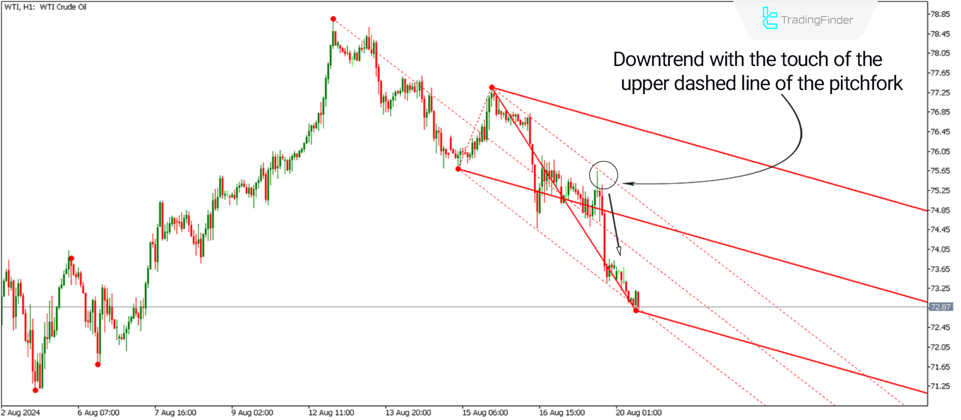 In the case of WTI (Crude Oil) on the H1 timeframe, the indicator constructs a pitchfork using the most recent pivot structure (high–low–high). As price interacts with the upper resistance channel, a sell signal is identified, anticipating a potential price decline from that region.