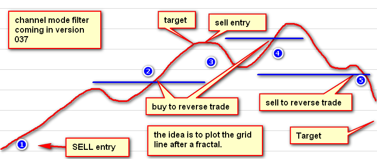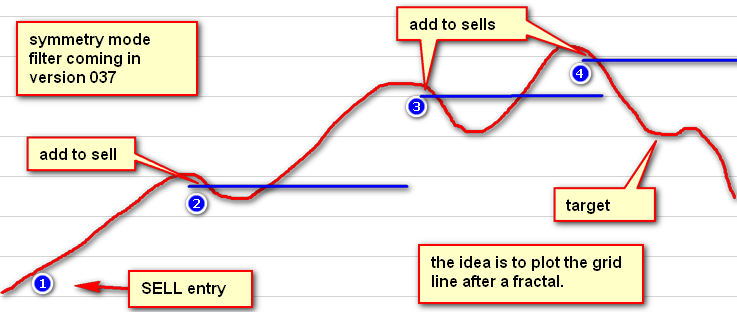 in symmetry, plot the grid line after a fractal on the opposite direction of the fractal. Sell the top, buy the bottom reversals.