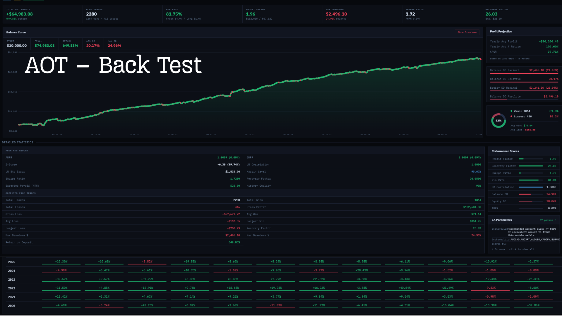 AOT, tek bir AUDCAD M15 grafiğinden 28 sembolü yöneten tamamen otomatik bir Expert Advisordır. Yapay zeka duygu filtrelemesini uyarlanabilir risk yönetimiyle birleştirir.
