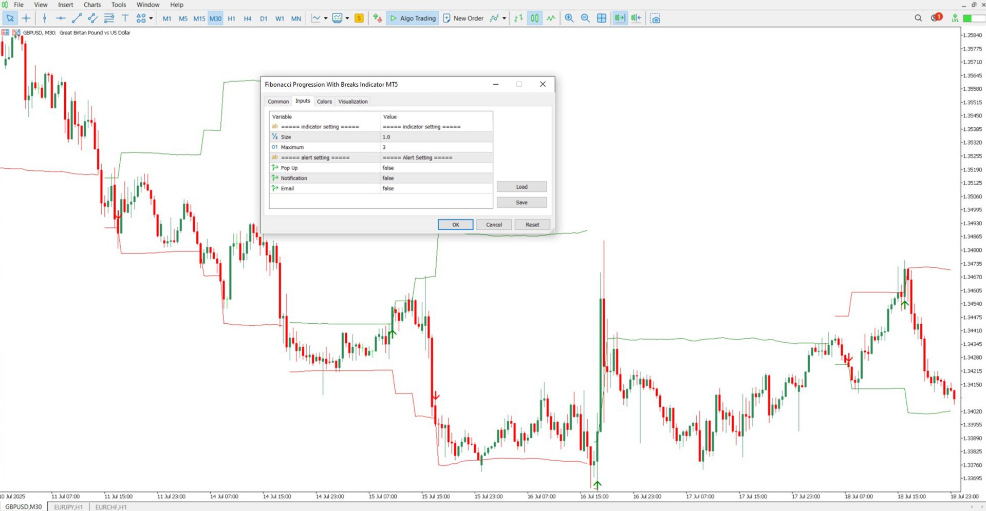 Here are the configurable parameters for the Fibonacci Progression with Breaks Indicator MT5: