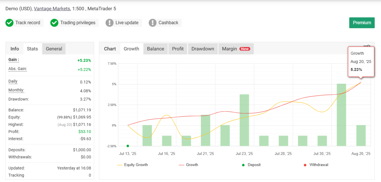 I will soon add my Real Account performance and Demo account performance links