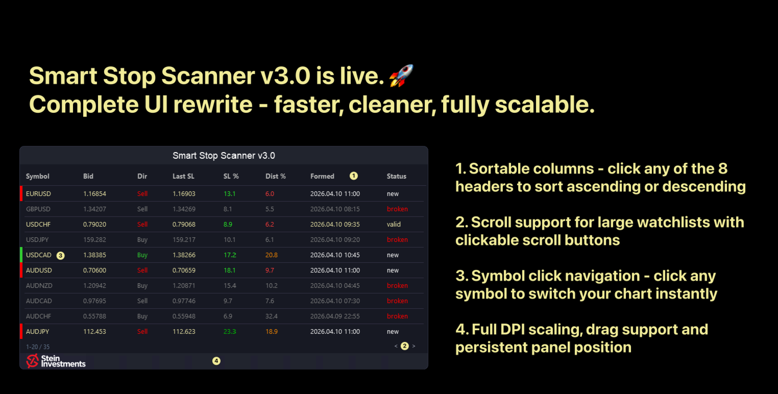 Smart Stop Scanner, birden fazla piyasadaki stop-loss seviyelerini profesyonel bir şekilde takip etmek için tasarlanmıştır. Sistem, gerçek piyasa yapısına dayanan breakout’ları, daha yüksek zirveleri ve daha düşük dipleri otomatik olarak algılar ve en önemli stop bölgelerini tespit eder. Tüm bilgiler, yüksek çözünürlüklü ekranlarla uyumlu (DPI-aware) net ve düzenli bir panelde sunulur. Forex, Altın, Endeksler, Metaller, Kripto ve daha birçok varlık sınıfını destekler.