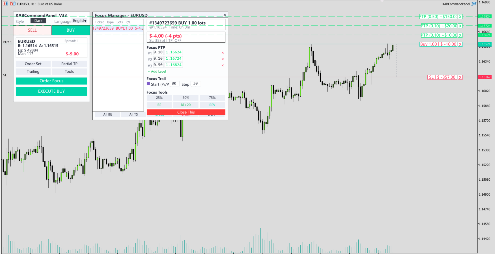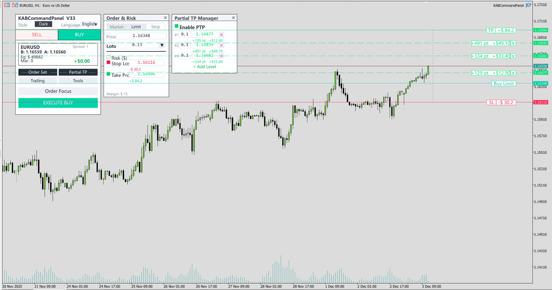 Partial Take Profit (PTP) – Configure multiple hidden Take Profit levels to close percentages of your position automatically.