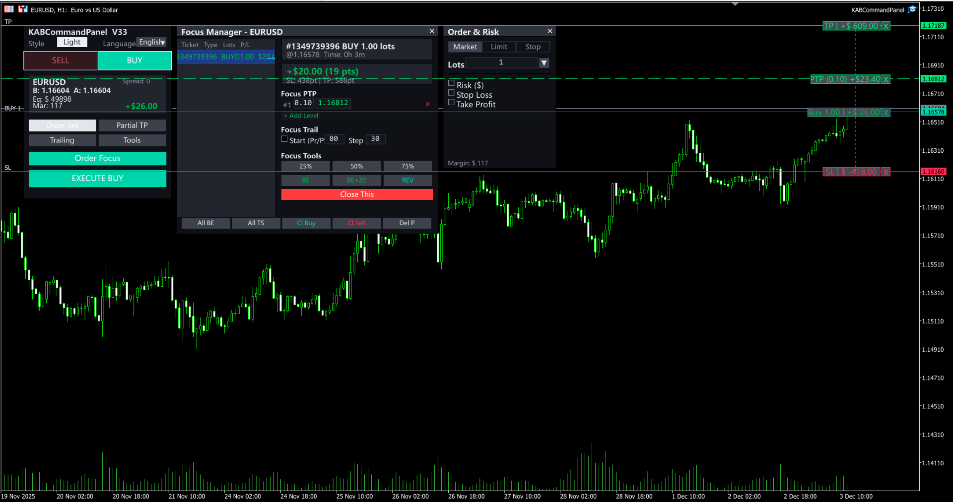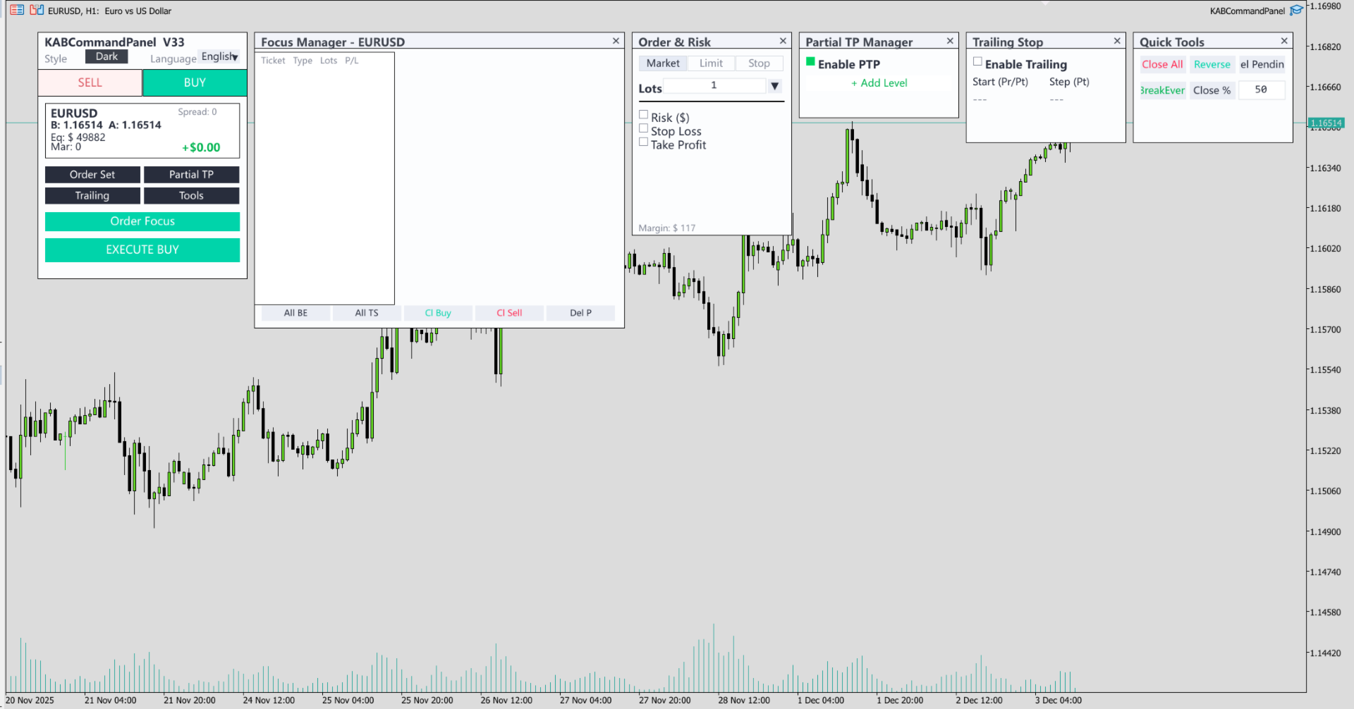 KAB Trade Manager is built for traders who need to execute fast but keep risk tight. It integrates all essential tools into floating, collapsible windows.