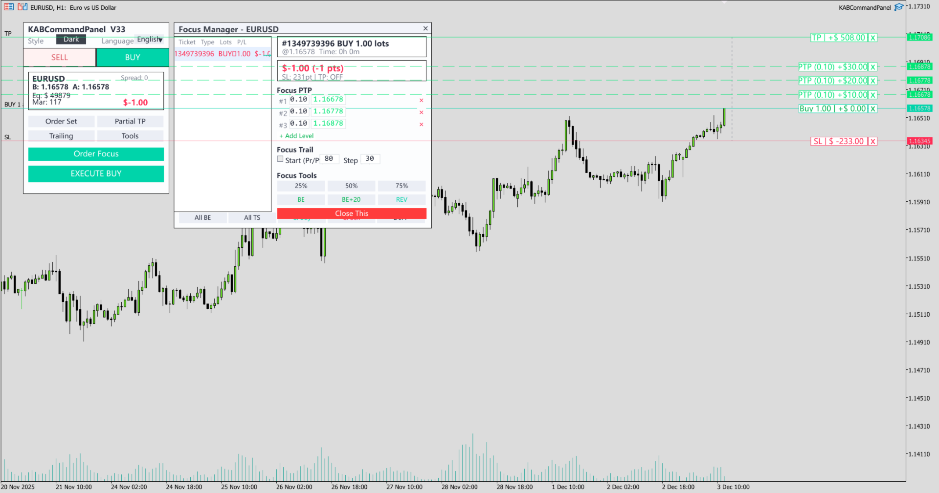 Focus Ticket Manager: A dedicated window to monitor and manage your most important active trade. View real-time P/L, distances, and modify SL/TP specifically for one ticket.