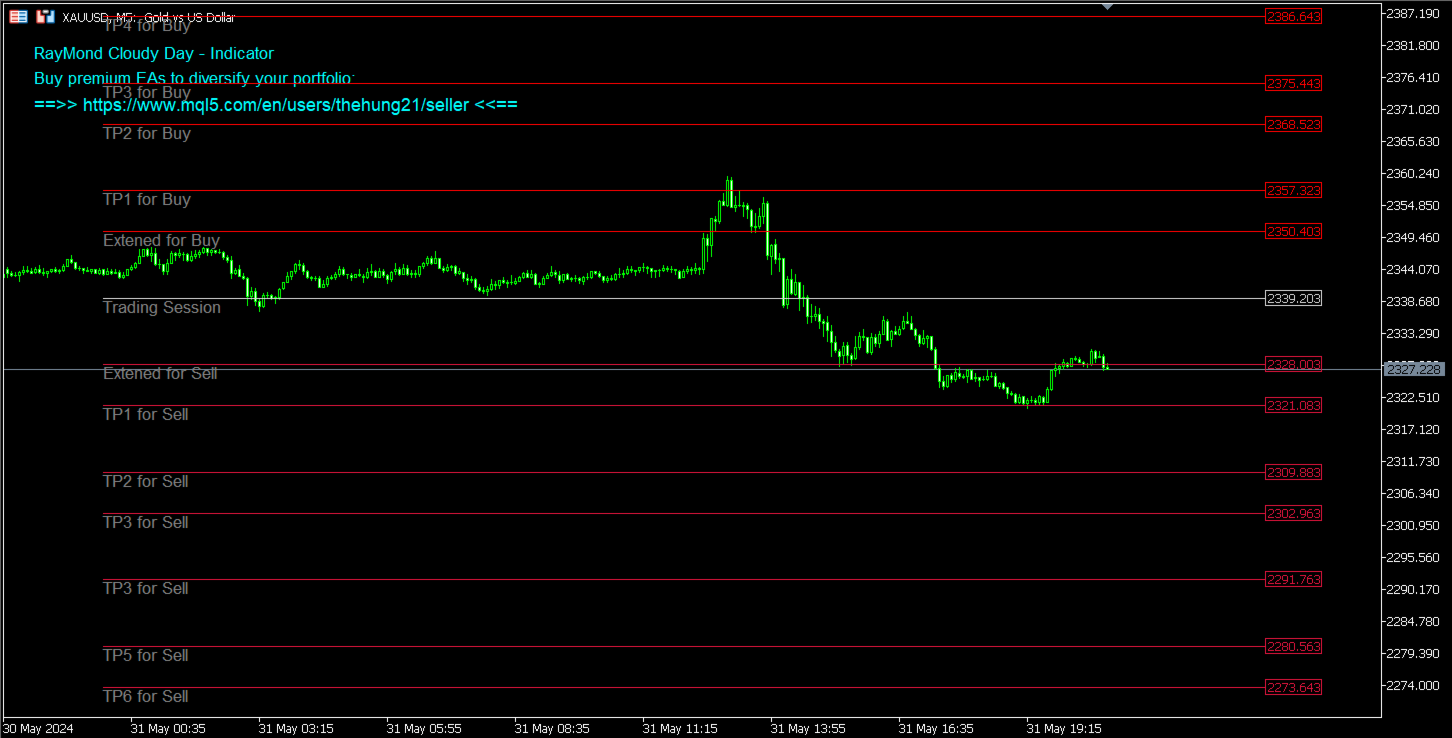 Raymond Cloudy Day Indicator applies an advanced pivot-based method to recent price action and plots a set of key levels on your MT4 chart. These levels include possible reversal zones around the main pivot, extension levels in the direction of the current move and take-profit areas further away from the current price. Support and resistance lines are derived from the same structure so that all levels remain consistent with one another.