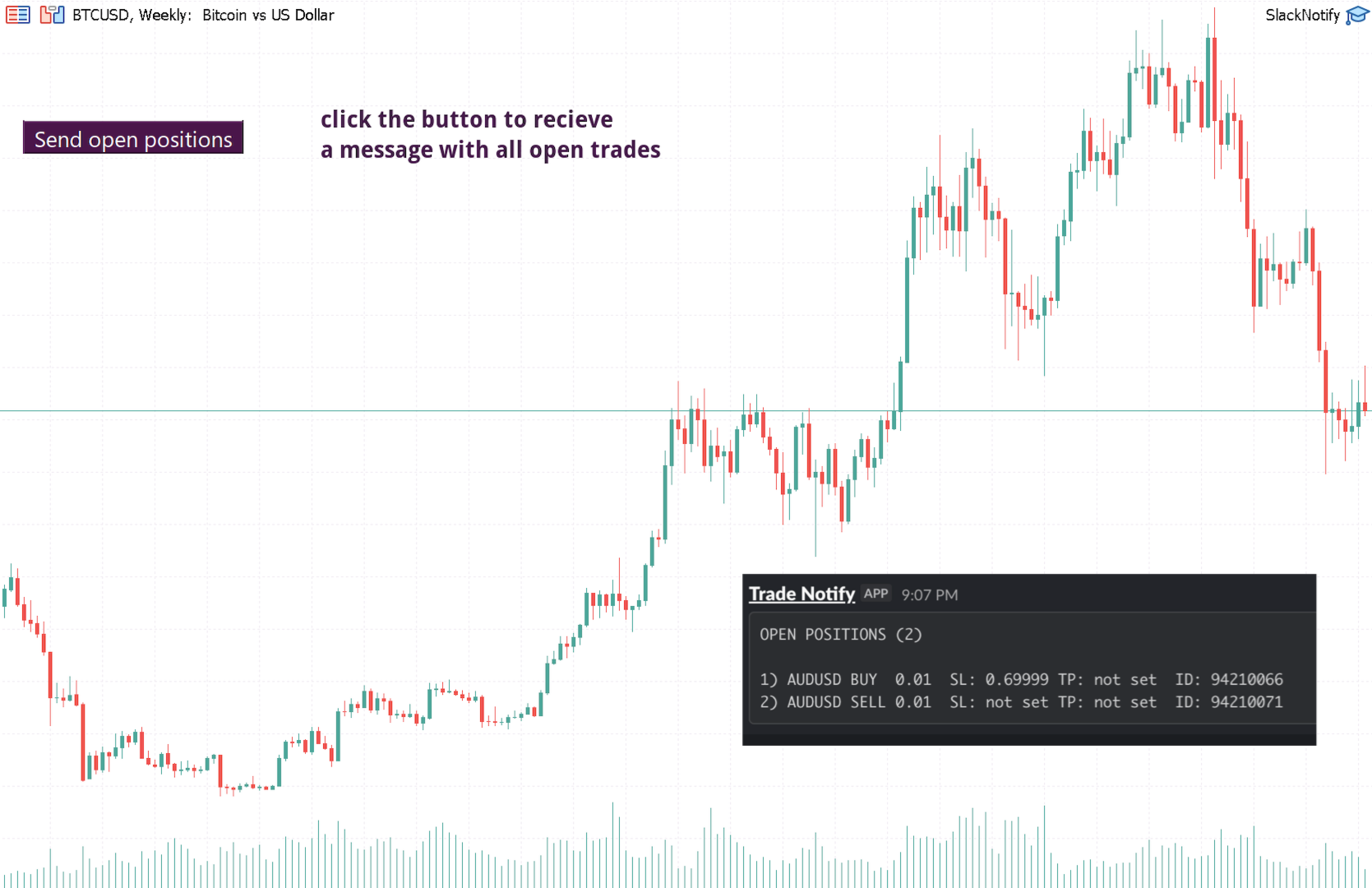 Sohbetin çalışmasını kontrol etmek için Test Slack düğmesi mevcuttur ve kurulumdan sonra grafikten gizlenebilir. Slack'a tüm mevcut açık pozisyonların tablo formatında bir listesini gönderen Send open positions düğmesi eklenmiştir.