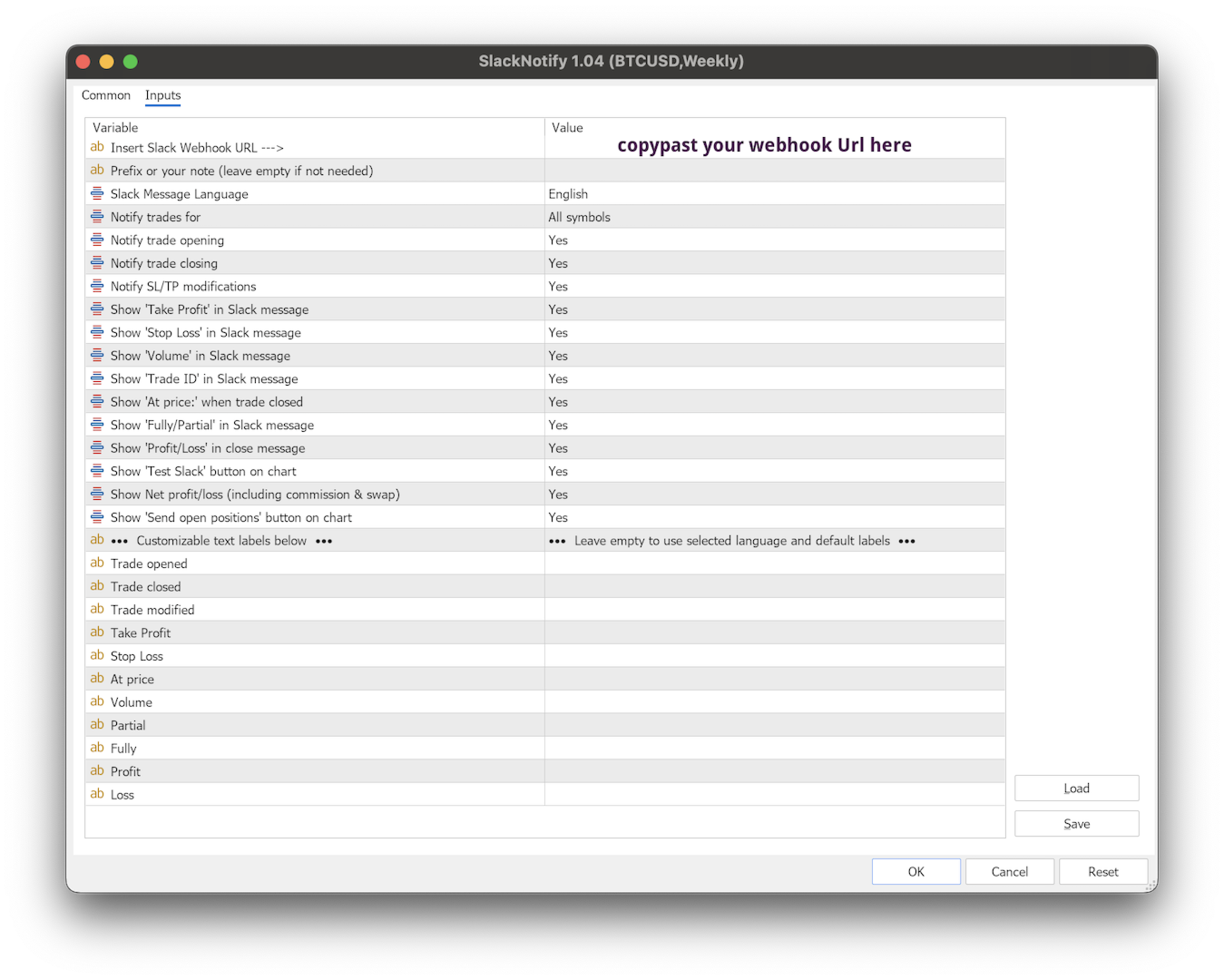 - MetaTrader 5’te → Tools → Options → Expert Advisor https://hooks.slack.com/ için WebRequest’i etkinleştirin, aracı herhangi bir grafiğe ekleyin ve Webhook URL’yi giriş parametrelerine girin.