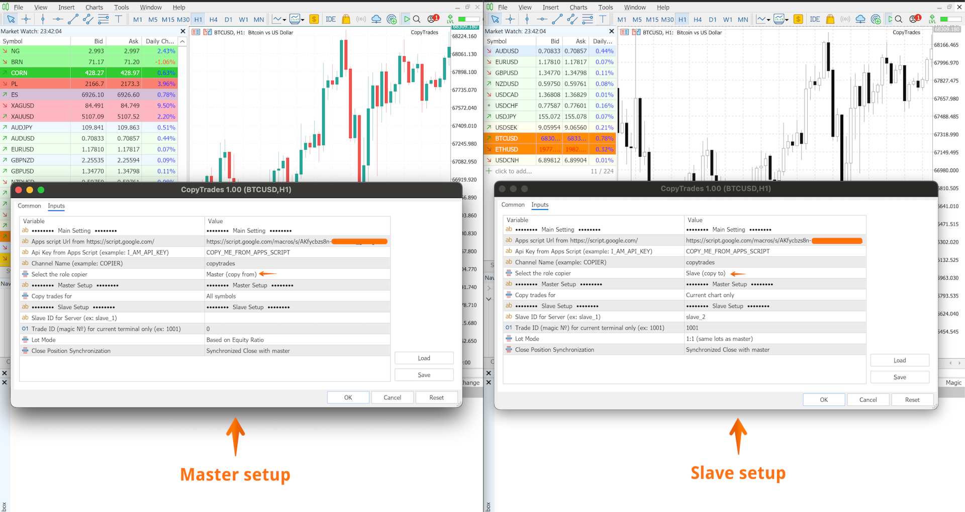- Enter the Google Apps Script URL in the Copy Trades input settings on both Master and Slave.