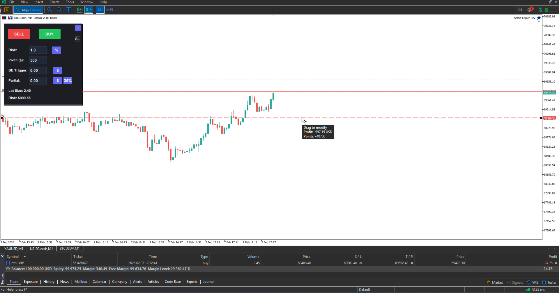 Drag your stop-loss line. See your lot size. Click to trade. Smart Copier handles the math so you don't have to. Precision Risk Management