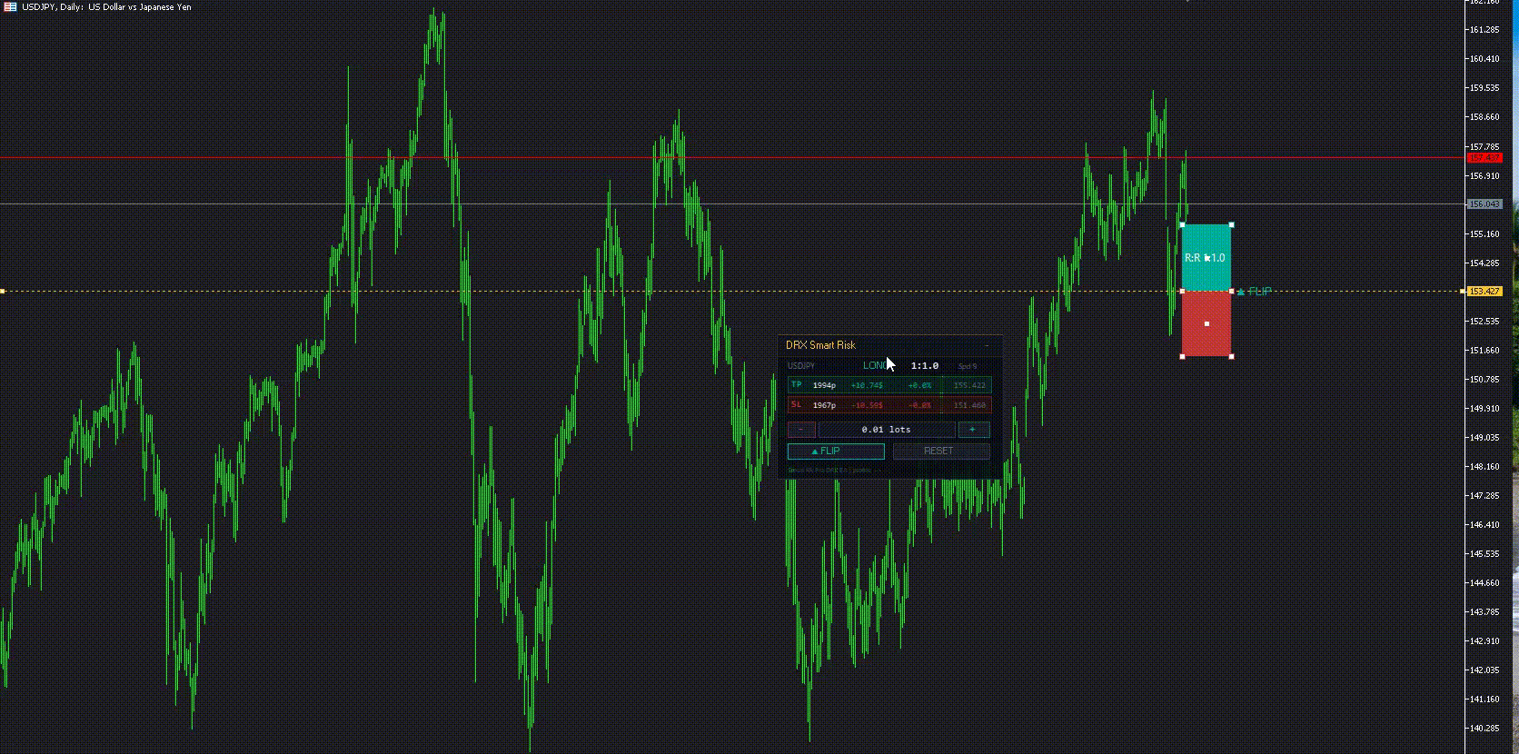 DRX Smart Risk, MetaTrader 5 için tasarlanmış, yatırımcılara risk yönetimi ve pozisyon büyüklüğü hesaplamalarında yardımcı olan bir grafik katmanı aracıdır. Standart çizgilerin aksine, bu yardımcı program, kullanıcıların Giriş, Zarar Durdur (Stop Loss) ve Kar Al (Take Profit) seviyelerini görsel olarak planlamasına olanak tanıyan etkileşimli bir arayüz oluştururken finansal metrikleri otomatik olarak hesaplar.