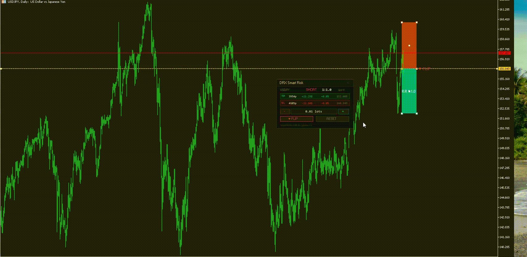 - Görsel Risk:Ödül Hesaplaması: Araç, grafiğe bir risk kutusu (Stop Loss) ve bir ödül kutusu (Take Profit) yansıtır. Çizgiler hareket ettirildikçe mevcut Risk:Ödül (R:R) oranını gerçek zamanlı olarak görüntüler.