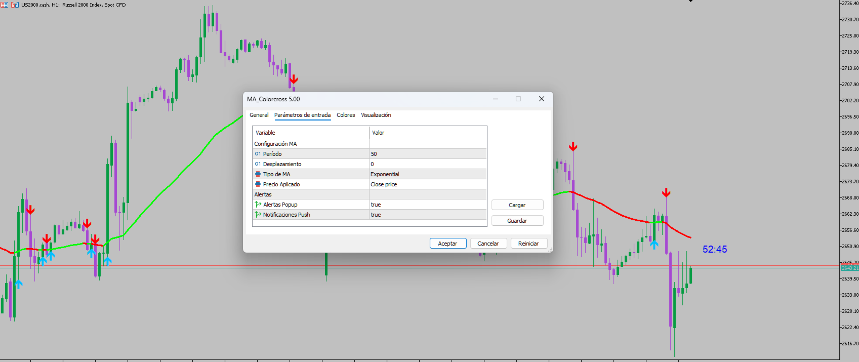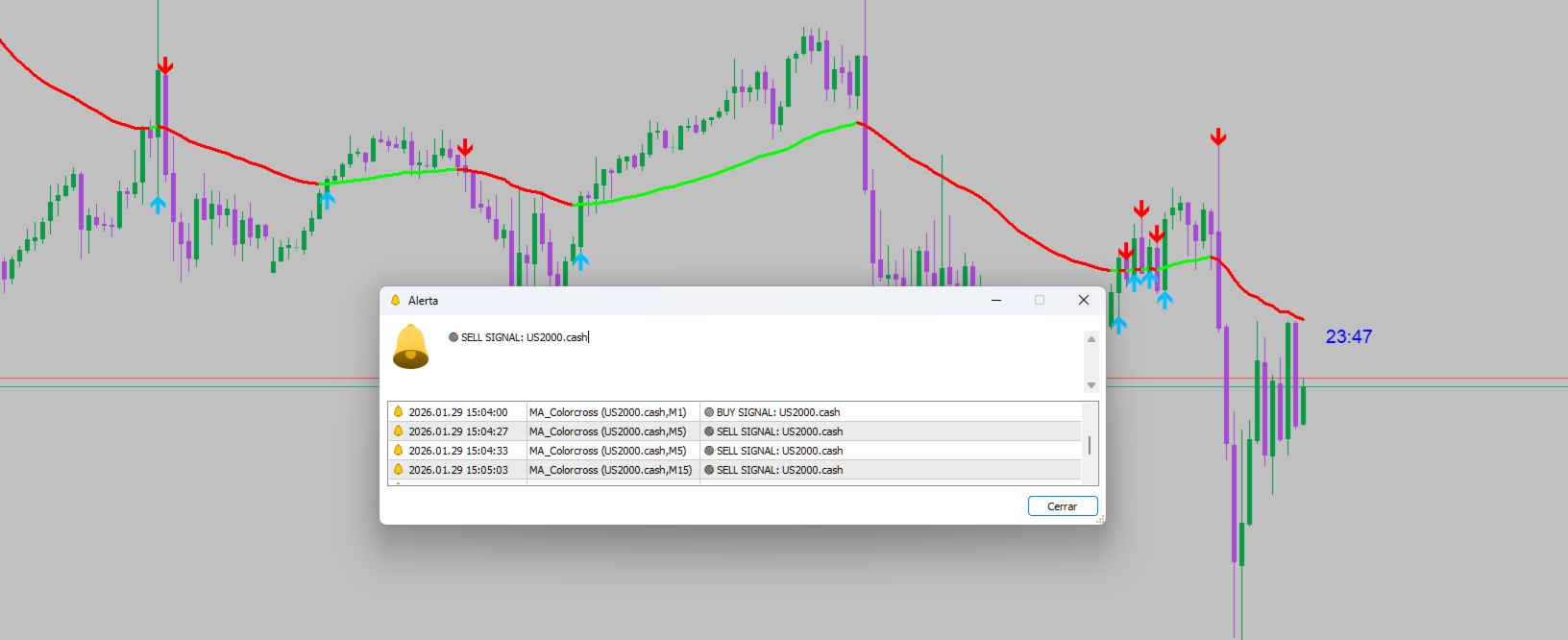A powerful and easy-to-use technical indicator that combines a fully customizable Moving Average with dynamic color changes, clear buy and sell arrows, and automatic alerts, all based on price crossovers with the Moving Average.