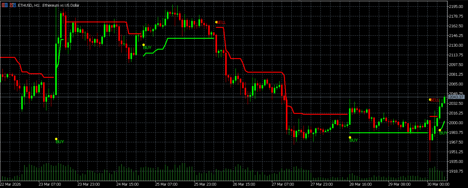 In a Downtrend: The indicator trails the lowest bottom. If the price rises above the trailing resistance line, a Buy signal is triggered.