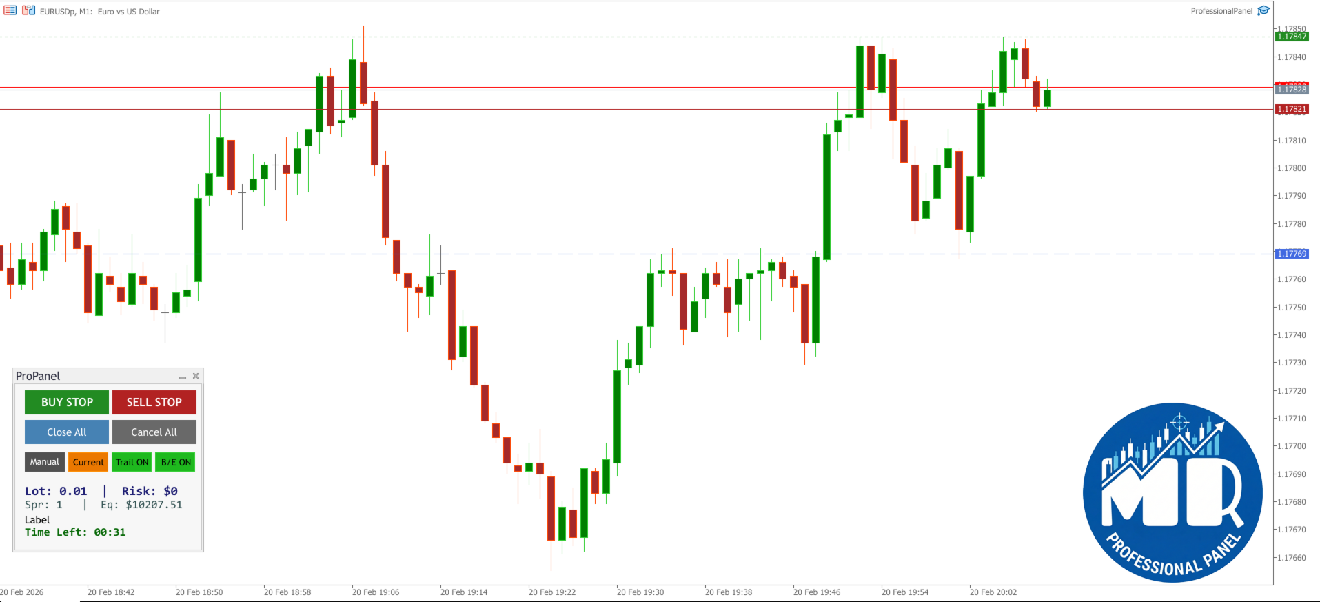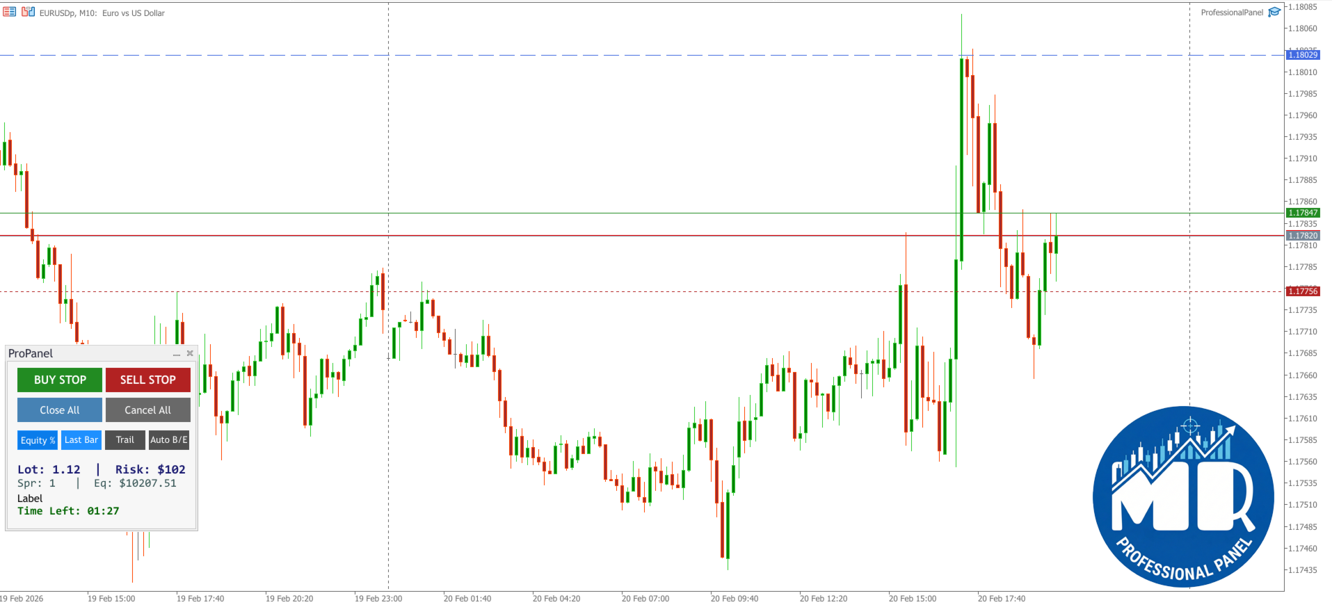 Auto-Position Sizing: Never use a lot size calculator again. Input your desired Risk % (e.g., 1% of equity), and the panel calculates the exact lot size for your Stop Loss distance.