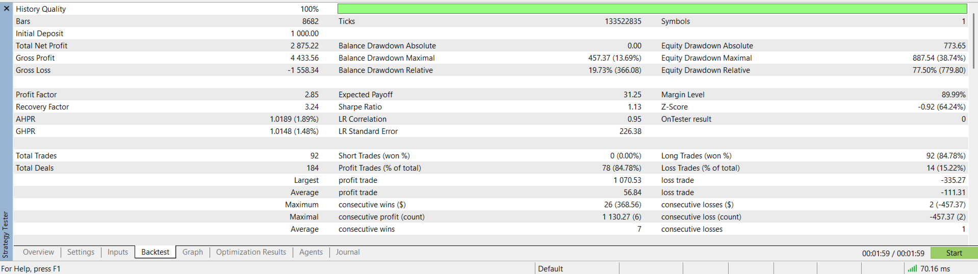Important: This Expert Advisor is designed to operate correctly only on the BTCUSD pair and only on the 1-hour timeframe. Running the system on other symbols or timeframes may result in unstable performance.