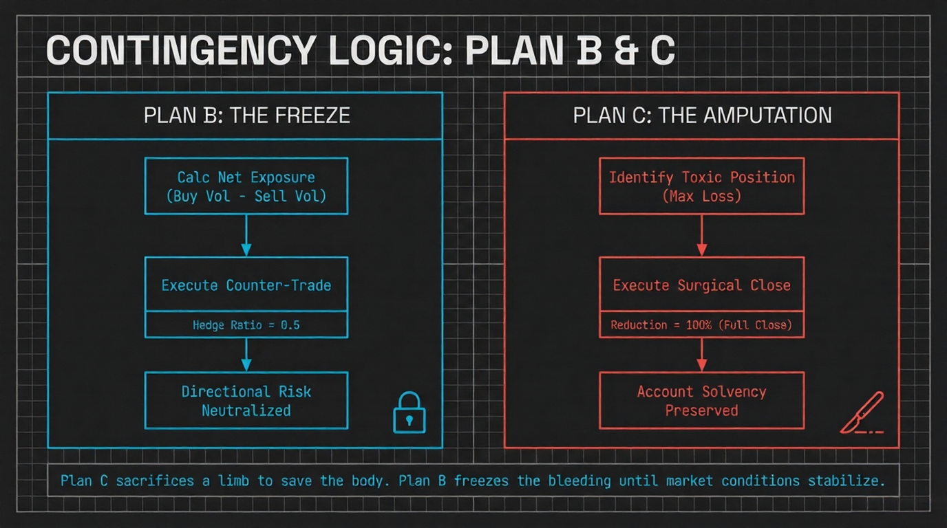 Plan C (Risk Seviyesi: Kritik) Sistemin son çaresi olarak kabul edilir ve Drawdown daha da uç bir sınıra (PlanC_DD_Threshold) ulaşırsa etkinleşir. Hesabı batırmaktan kaçınmak için "cerrahi bir ampütasyon" gibi çalışır:
