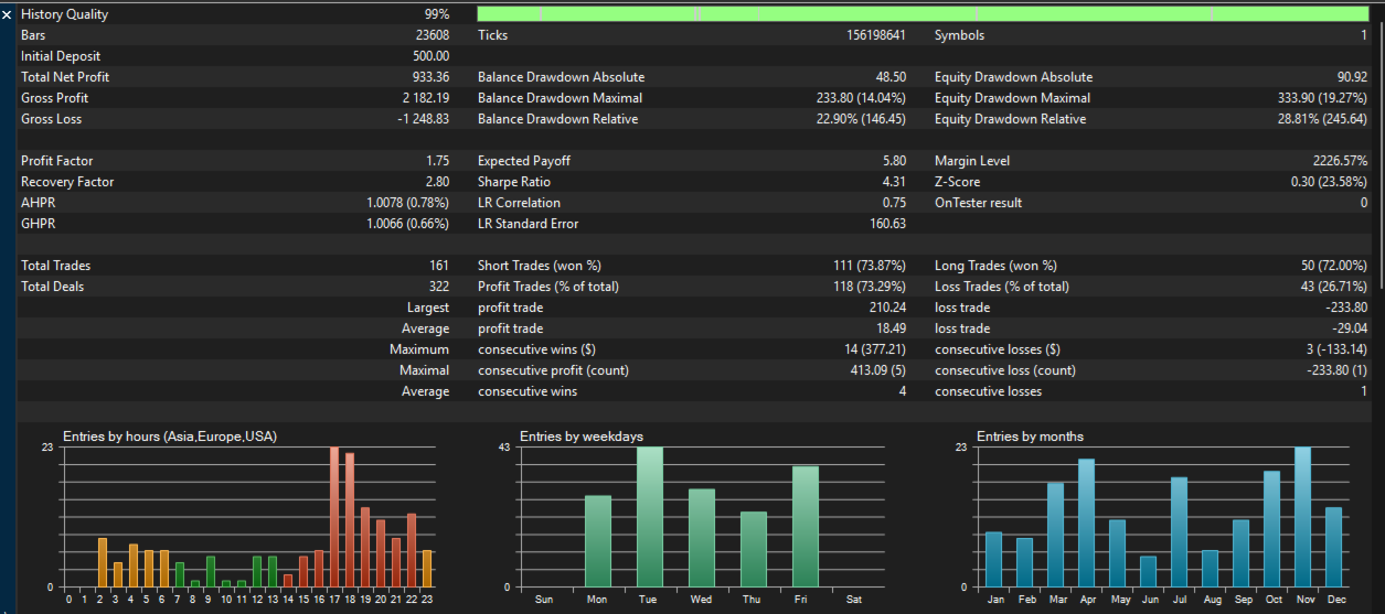 Sermaye Büyümesi: Sistem 500.00$ başlangıç depozitosu ile başlamış ve toplam 933.36$ net kâr elde etmiştir. Bu, test süresi boyunca hesabın başlangıç bakiyesini neredeyse üç katına çıkardığı anlamına gelir.