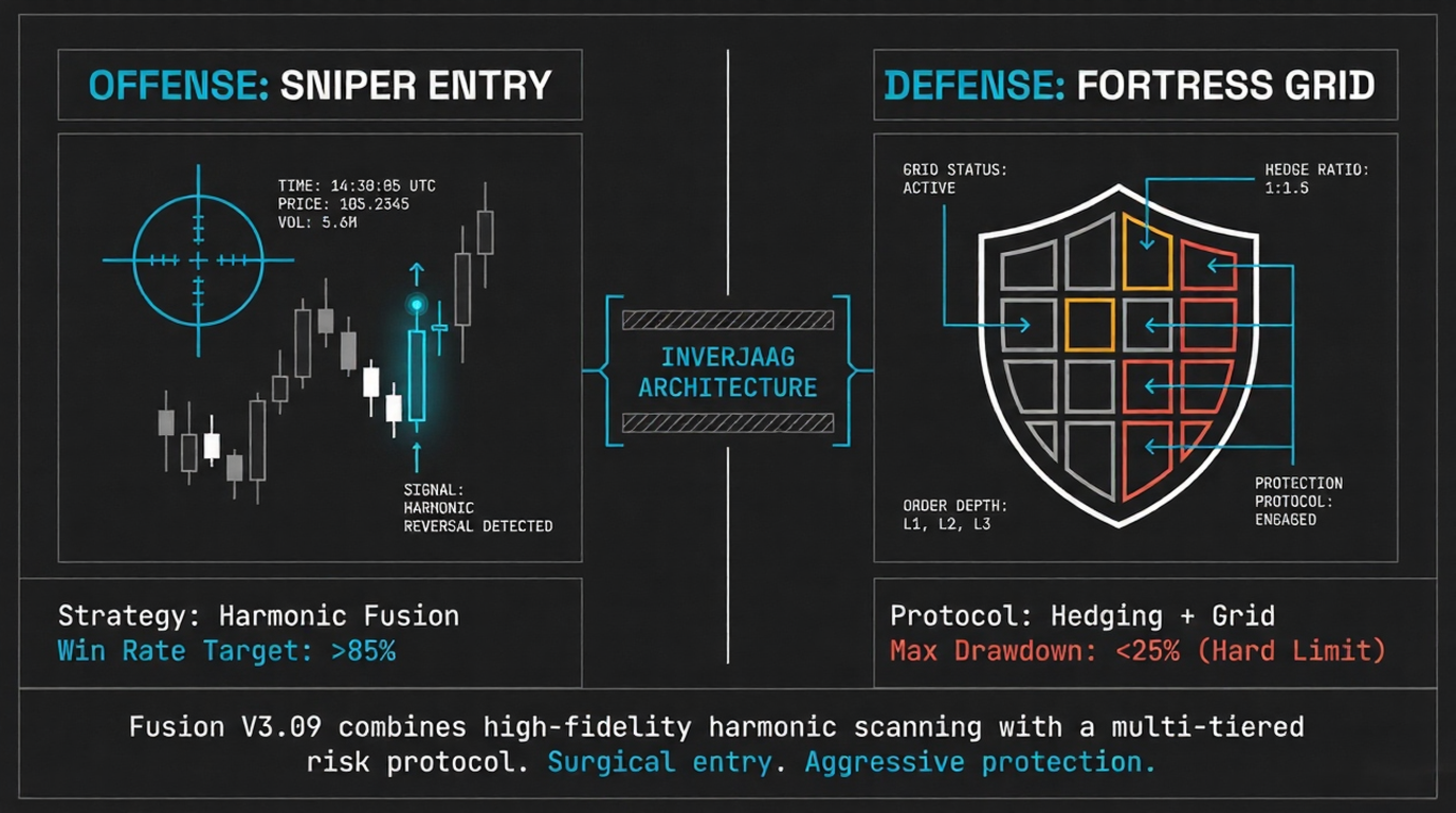 Fusion Harmonic Intelligence, MetaTrader 5 platformunda çalışmak üzere tasarlanmıştır. Bu araç, piyasada kesin giriş noktalarını belirlemek için harmonik formasyon analizini RSI ve hareketli ortalamalar gibi geleneksel teknik göstergelerle birleştirir. Yazılım, önemli kayıplara karşı acil durum planları, entegre bir haber filtresi ve sermayeyi korumak için agresif bir hedge (korunma) sistemi içeren sağlam risk yönetimi ile öne çıkar. Ayrıca, dinamik bir takip eden durdur (trailing stop) motoru ve akıllı bir grid (ızgara) stratejisini etkinleştirme olanağı aracılığıyla operasyonel esneklik sunar. Programın temel amacı, sıkı güvenlik parametreleri altında düşüşü (drawdown) kontrol altında tutarken kârlılığı maksimize etmektir.