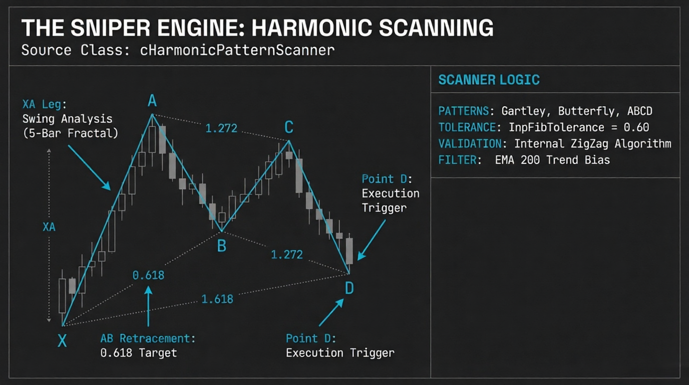 Bu algılamayı gerçekleştirmek için cHarmonicPatternScanner sınıfı, piyasa hareketlerini tarayarak öncelikle 5 ana salınım noktasını veya "swing"i (X, A, B, C ve D) belirler. Ayrıca sistem, formasyonun geçerli kabul edilmesi için geometrik oranın ne kadar kesin olması gerektiğini belirlemek üzere kullanıcının bir Fibonacci toleransı (InpFibTolerance) yapılandırmasına olanak tanır.