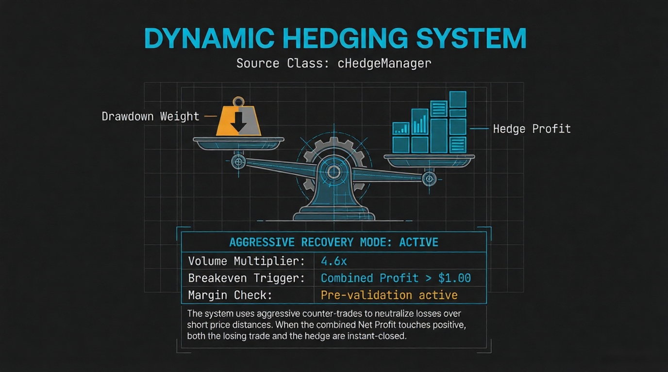1. Akıllı Hedge (Smart Hedge): Sistem net piyasa pozisyonunu hesaplar (alış ve satış pozisyonları arasındaki toplam hacim farkı). Ardından, PlanB_HedgeRatio oranıyla (varsayılan %50 veya 0.5) belirlenen bu hacmin bir kısmı kadar ters yönde otomatik olarak bir işlem açar. Bu, Drawdown'ı kısmen "dondurmaya" hizmet eder.