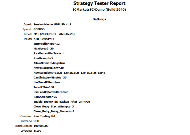 ATR-14, Buffer Pips-12, Max Spread-20, Risk Per trade-1%, Risk Reward-RR 1:5, News Trading-True, News Block Min-30, Candle Expiry Minutes-30, Use Trend Filter-True, Trend EMA-100, Use Candle Body Filter-True, Candle Body Filter- Body_0.25, Enable Broker BE-True, How many retries-3, Delay Between Retries-2.