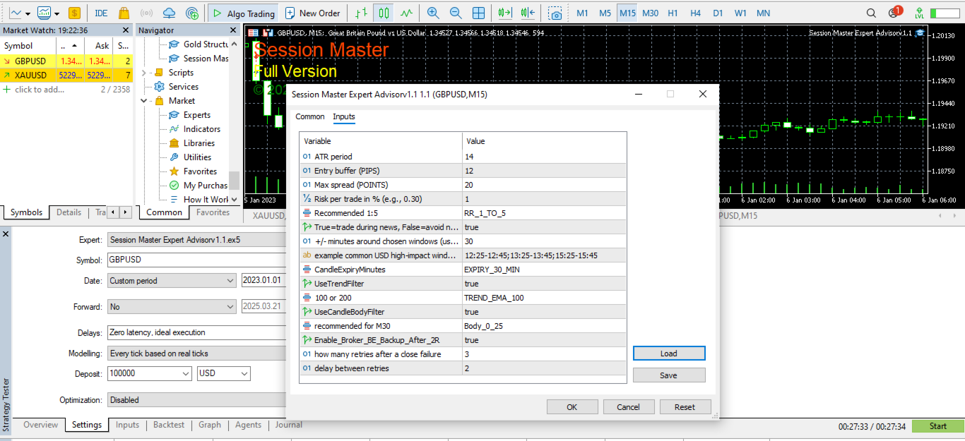 Session Master EA is a fully automated GBPUSD Expert Advisor for Meta Trader 5 (MT5), designed for disciplined structure-based trading with Trend filters. Since it follows Momentum Based Strategy it is intended to trade ONLY during the Peak US session using strict Break of Structure (BoS) logic and controlled risk management.