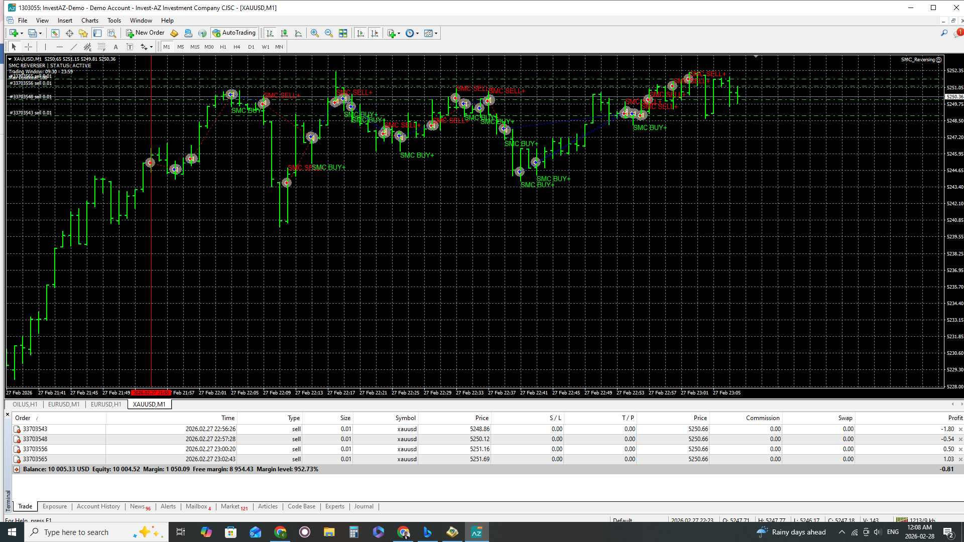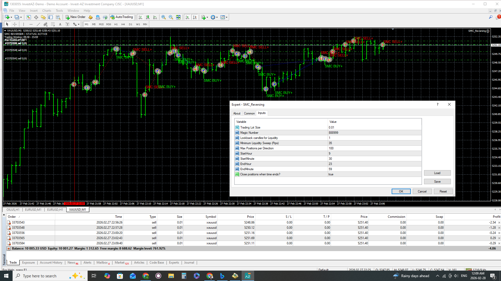 "Hello everyone! I am currently testing the SMC Reverser on a $10,000 Demo account using the M1 Timeframe on XAUUSD.