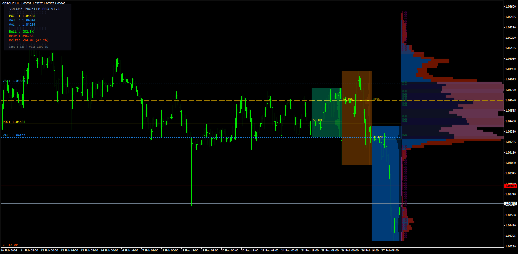 The indicator calculates and displays a Visible Range Volume Profile (VRVP) that automatically updates as you scroll the chart. Every time you change the visible range, the profile recalculates in real time, ensuring the analysis is always relevant to your current view.