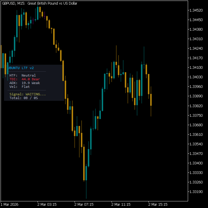 DASHBOARD: Shows HTF bias, ADX strength, resumption status, range detection, entry/SL/TP levels, and total buy/sell signal counts.