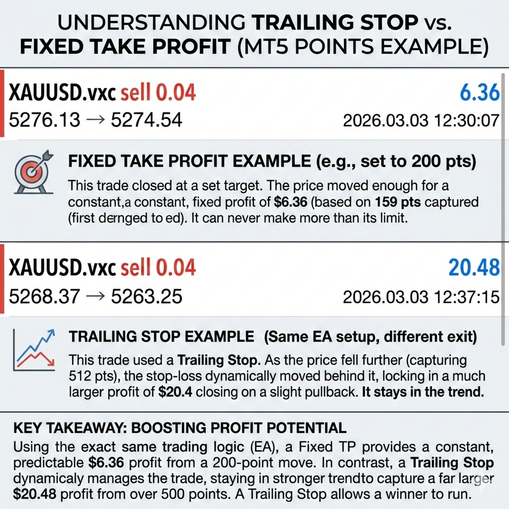 Flexible Exit Strategy: Switch between Trailing Stop to ride strong trends or Hard Take Profit for guaranteed targets.