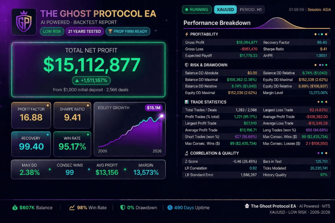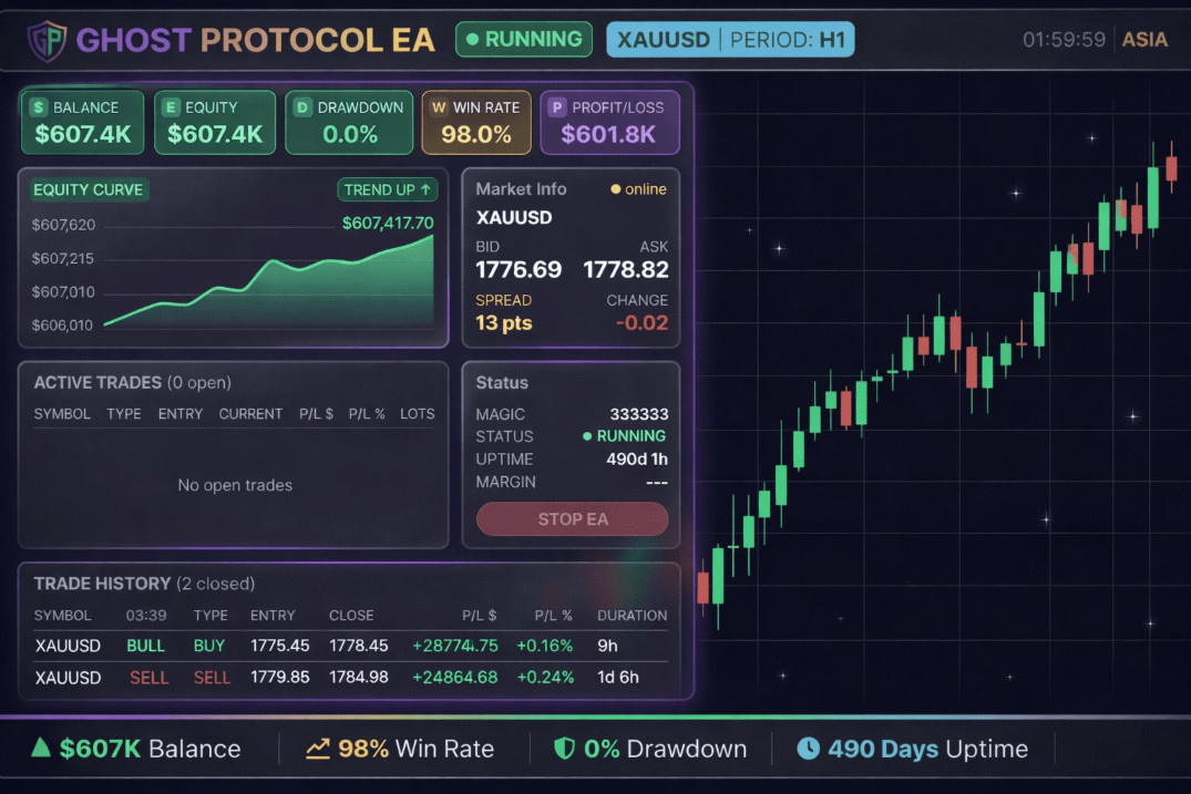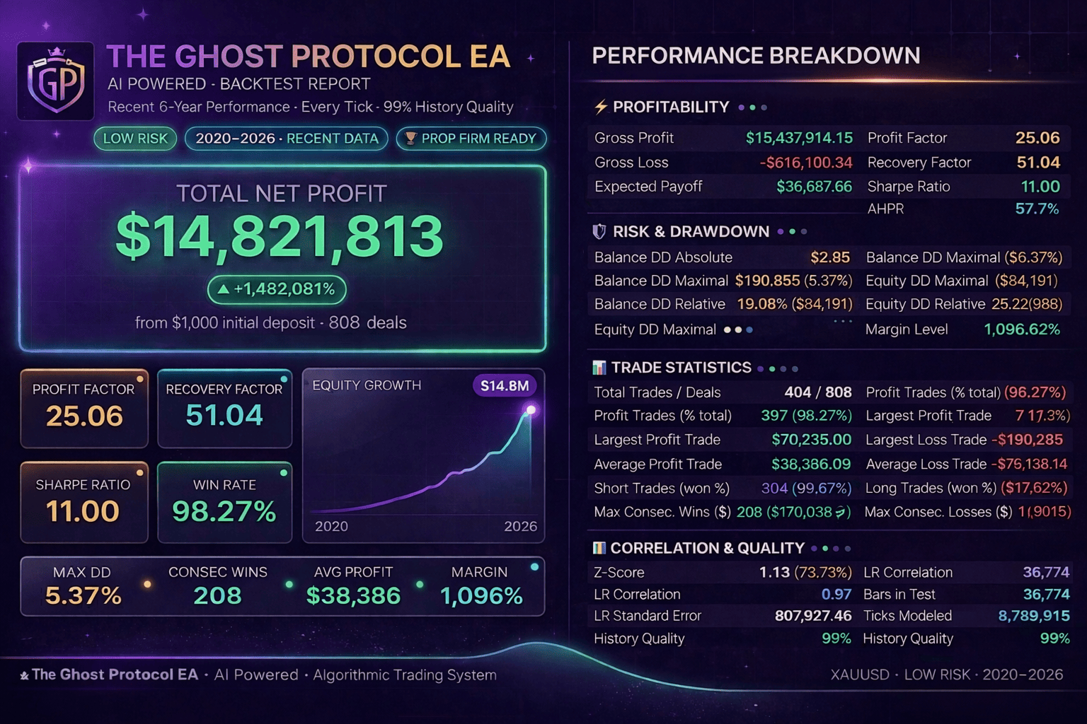 Uyarı: Finansal piyasaların temel doğası stokastiktir. The Ghost Protocol EA, matematiksel olasılıklar ve tarihsel veri korelasyonları çerçevesinde çalışır. 2005–2026 dönemi için geriye dönük performans istatistiksel bir temel oluşturur ancak yapısal piyasa değişimleri veya "Siyah Kuğu" olayları altında aynı sonuçları garanti etmez. Operatörün sermayesi kalıcı olarak piyasa riskine maruzdur; Ghost Protocol aşırı hassasiyete sahip bir araçtır, ancak algoritmanın gölgesinde bile piyasa canlı ve öngörülemeyen bir varlık olmaya devam eder.