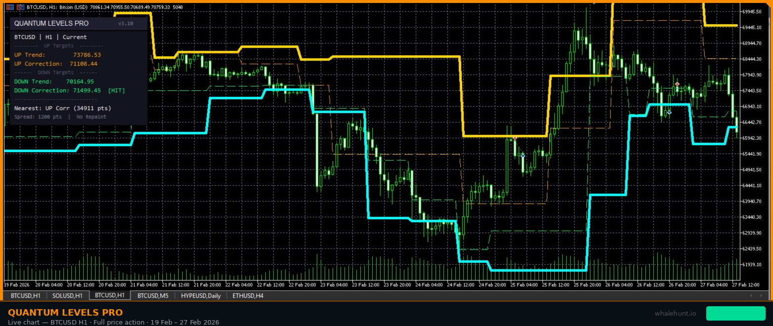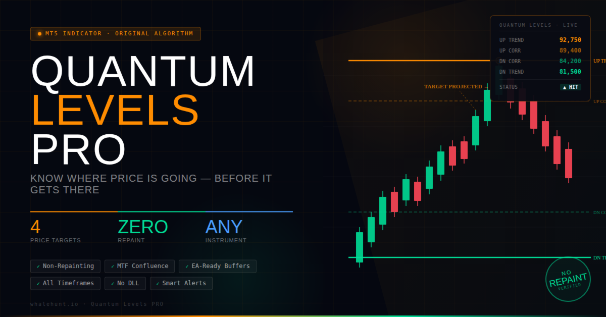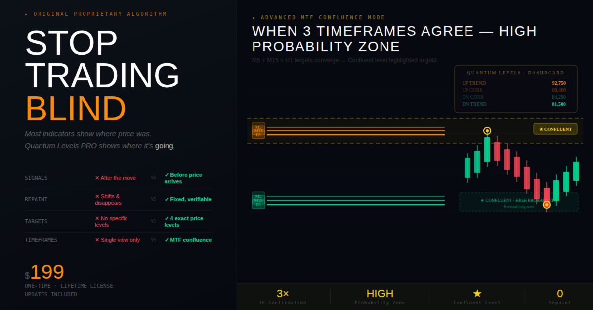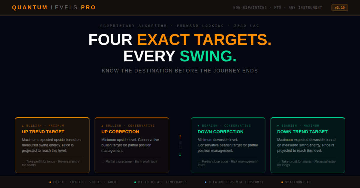 Quantum Levels PRO farklıdır. Hareket hâlâ gelişirken, fiyatın bir sonraki yöneldiği kesin hedefleri hesaplar. Yolculuk tamamlanmadan varacağınız yeri görürsünüz. Bu geriye bakmak değil, ileriye bakmaktır.