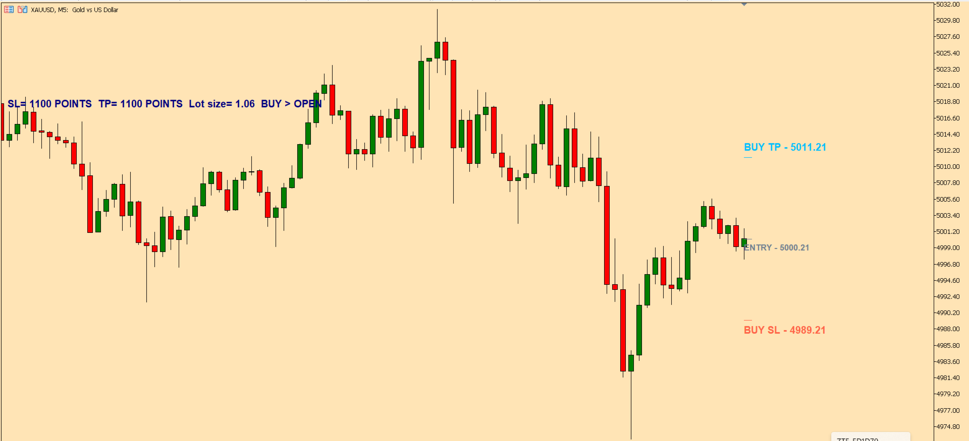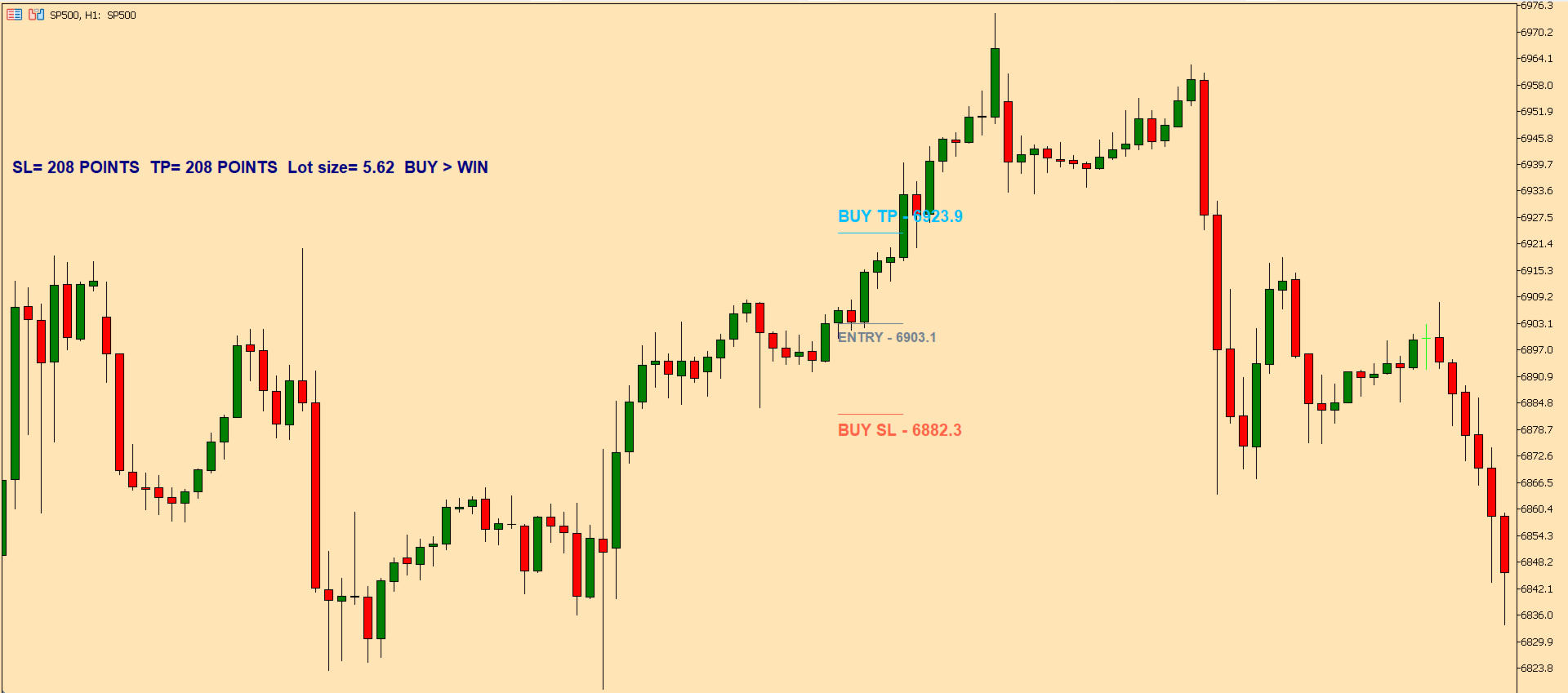 The Entry price is taken from the selected candle close or from the current live candle price, depending on where the projection is created. The indicator then reads current market volatility and adjusts Stop Loss and Take Profit levels to the current market situation.